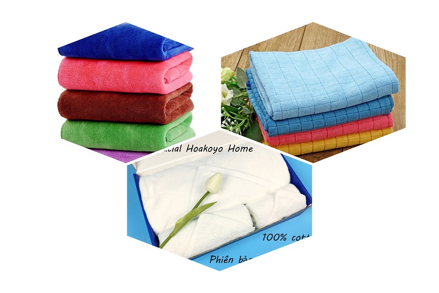 Sản phẩm khăn khách sạn, spa, salon của công ty TNHH Hoakoyo. Khác với khăn gia dụng được sử dụng trong các gia đình, khăn khách sạn, spa, salon có chức năng, kích thước và màu sắc riêng biệt hơn. Ví dụ chất liệu yêu thích của các spa và salon là Microfiber bởi đặc