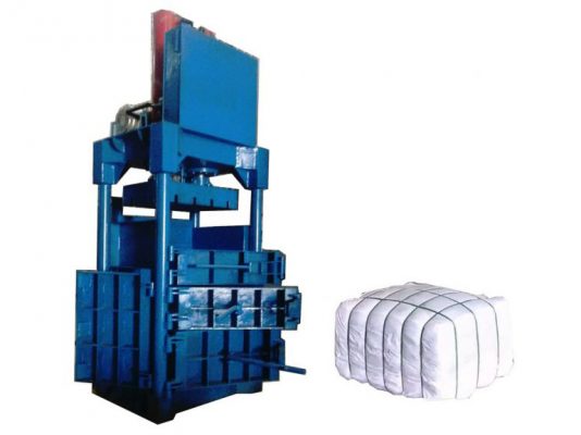 Máy ép kiện và một kiện khăn bông đóng bằng đai và bao nilong.